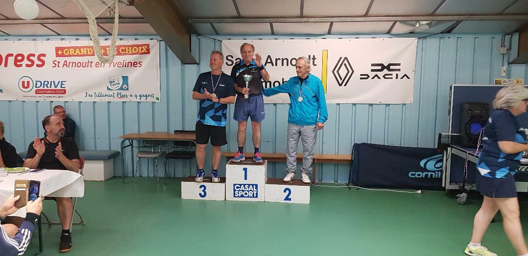 A Saint-Arnoult-en-Yvelines en ce 11 novembre, nous avions 2 représentants au championnat départemental vétérans. Notre éternel jeune homme Pierre Danielsky s'est imposé et devient champion des Yvelines, dans la catégorie des +70 ans (cf. photo), alors qu'Alain Bertrand s'est incliné en 1/8èmes de finale face au futur vainqueur dans la catégorie des +60 ans. Ces 2 catégories ont enregistré respectivement 4 et 23 compétiteurs.