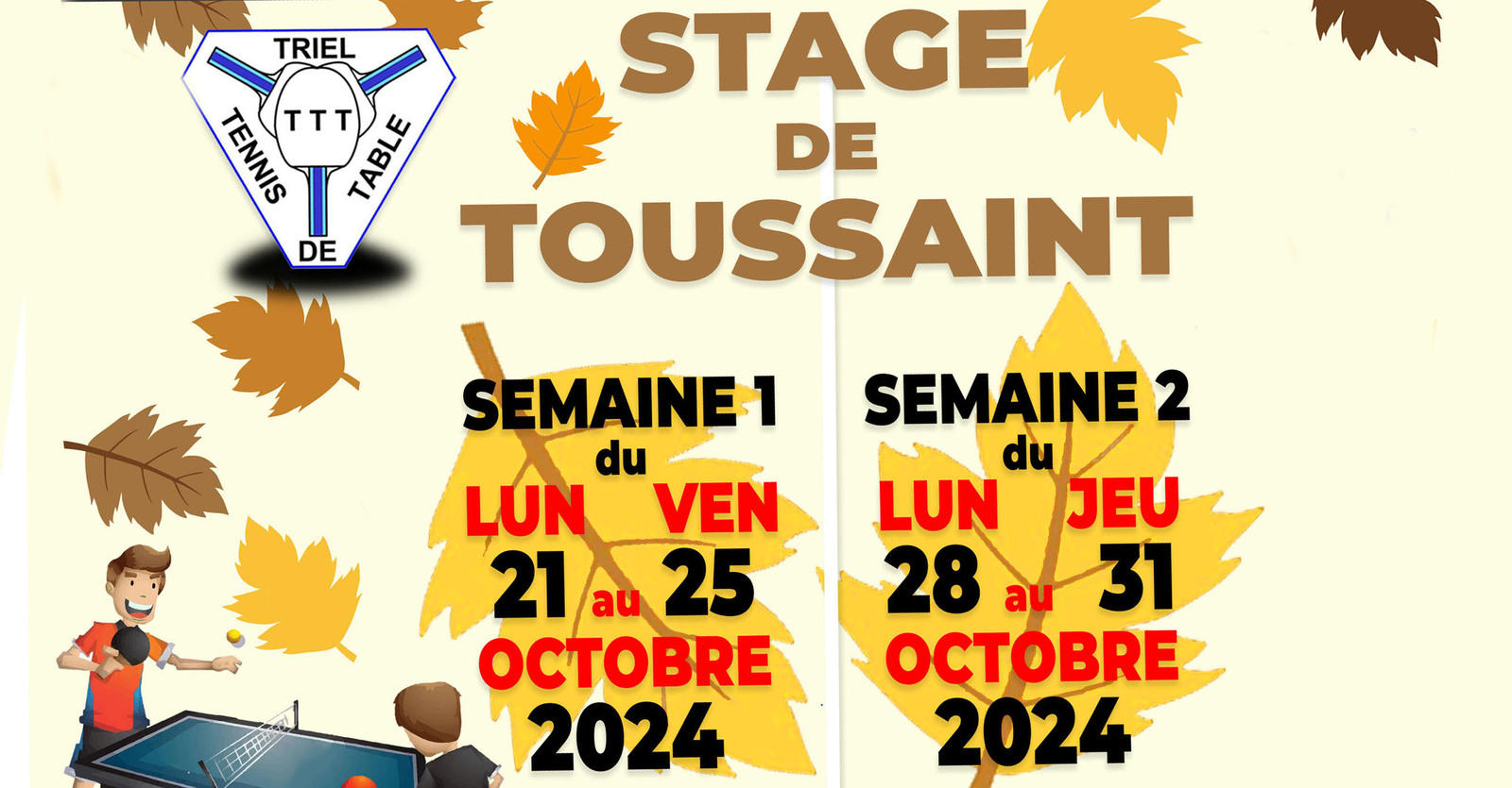 Un stage, auquel participe un de nos entraîneurs Jérémy Lacabanne, est organisé à Triel pendant les vacances de la Toussaint. Toutes les informations nécessaires pour les personnes intéressées sont sur le flyer.